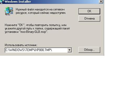 Привет, ситуация такая, после кривых рук слетел офис, при чем в запись о Офисе (2003) в "Установить/удалть программы" присутсвует но никак не удаляется, самой папки в программ файлс нет, при попытке установить офис заново пишет то, что показано на картинке..