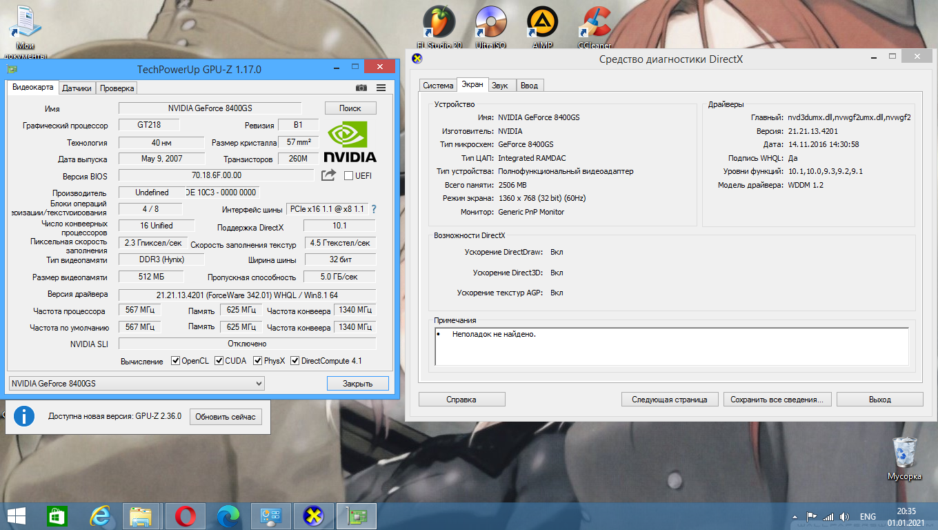 В общем, стоит у меня windows 8.1 и стоит, но сегодня меня что-то попёрло обновить до windows 10. Скачал образ с официального сайта и записал на флешку, начал устанавливать и подготовил для неё отдельный раздел, на всякий случай, мало ли.. Ох, как же хорошо что я это всё сделал При установке (после перезагрузки) я столкнулся с графическими артефактами. Подумал мол проблема с драйверами, щас система дрова свои подгонит и все будет чики-пуки. Но нет, лучше не стало. Короче винда так и не стала, откатилась, удалив все свои файлы полностью и откатила мне загрузчик чтобы я мог загрузить 8.1, после первой её загрузки она выдала ошибку об ошибке установки windows 10. Немного о ПК, хотя на скринах впринципе все видно: Мать: Abit NF-M2SV socket AM2 Процессор: двухядерный Atlon 64 x2 4200+ 2.2 Ггц Оперативка: две планки Kingston и Nancy (хз че это за память), 4 гига DDR2 в двухканале (хз как завелся двухканал) Видеокарта: та самая GeForce 8400 GS, с которой видимо конфликтует 10ая винда (ниже опишу её конкретно) Жесткие: первый samsung на 250 гб (с 8.1) и второй Western Digital на 80 гигов, его я и взял для теста. Оба SATA БП: Power Magic (или чето в этом духе) на 500W Ниже будут скрины как выглядит установка и скрины уже с 8.1 Windows. Как видно, в винде драйвера установлены и нет ни намека на отвал. Видюха рабочая, можно даже GTA 4 запустить, насколько это играбельно - решать каждому, лично мне такая картинка режет глаз. Ну ладно, сейчас не об этом. Так а почему видеокарта необычная? Я смотрел, она существует лишь в двух комплектациях - 128 мб GDDR2 и 256 мб GDDR2 с VGA, а у меня переделка от компании Palit с 512 мб GDDR3 памяти, и отсутствует выход на VGA, только DVI-I. Использую переходник DVI-I -> VGA. Хотел бы услышать мнение более опытных пользователей ПК чем я. Прикрепляю все скриншоты. Лично мне кажется, что проблема всё-таки в видеокарте, и скорее всего в этом самом переходнике, ведь на встройку система встала и работала без проблем, но я могу быть не прав. Заранее благодарю за помощь. P.S. Кому надо скину лично все фотографии, на этом форуме слишком много лимитов |