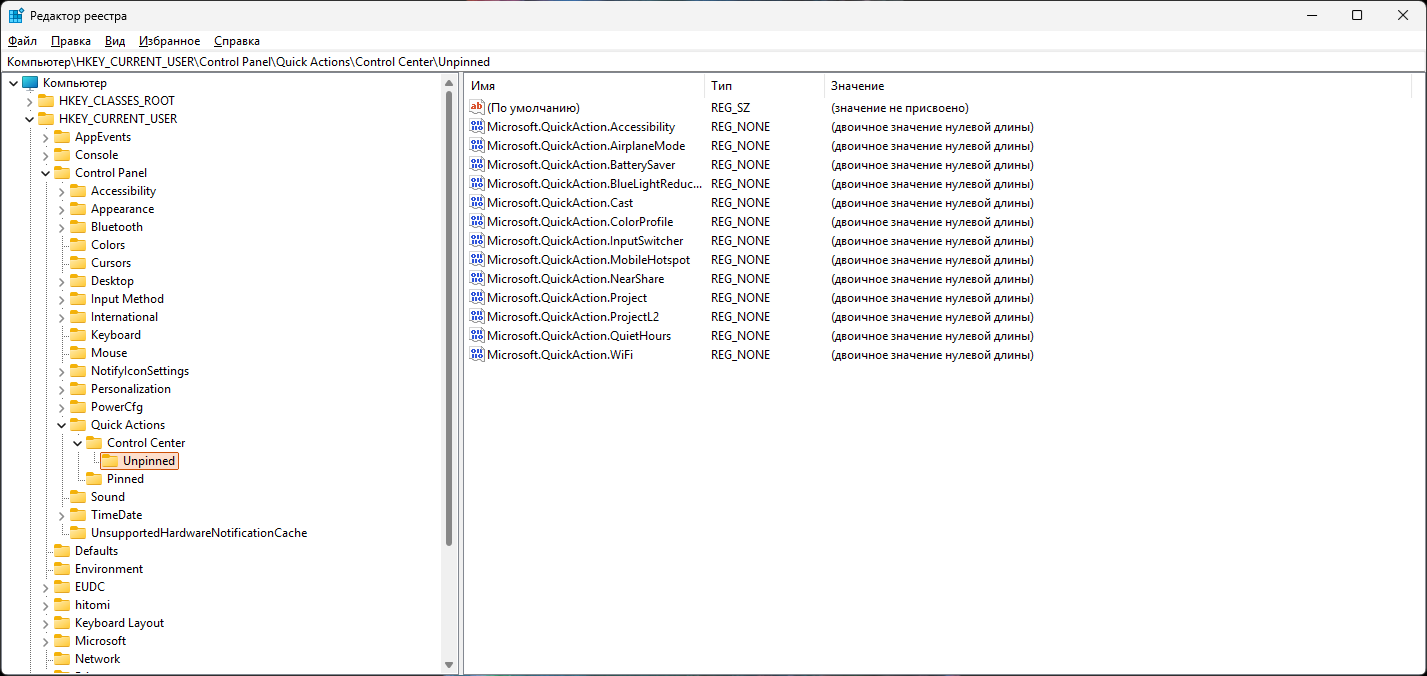 HKEY_CURRENT_USER\Control Panel\Quick Actions\Control Center\Unpinned если есть параметр Microsoft.QuickAction.Edit - удалите. |