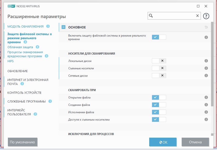 Безопасность - Отключение сканирования ESET, без отключения "защиты в реальном времени"
