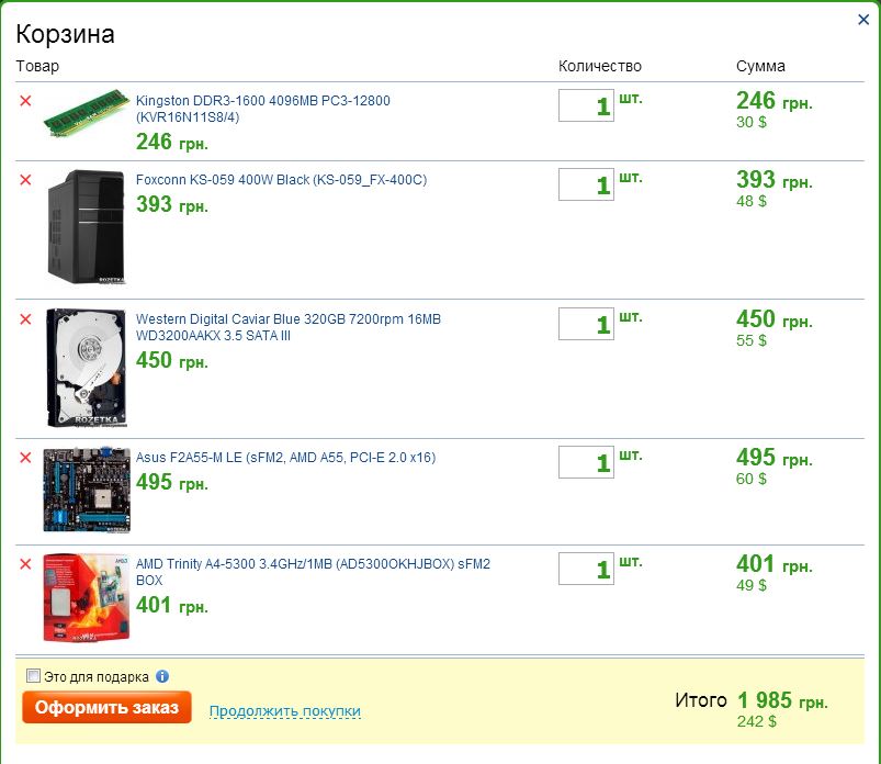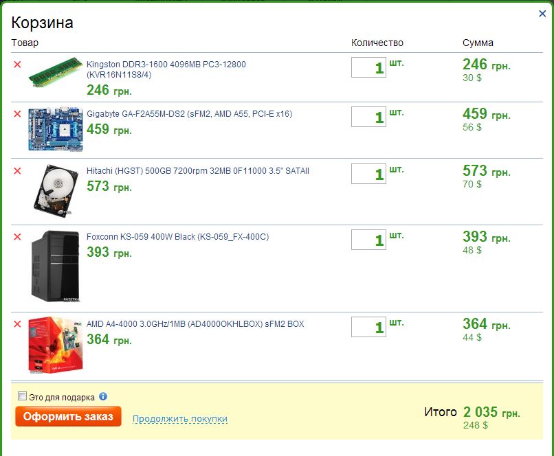 Мне снова нужен совет по этой же сборке. Во-первых, появилась возможность чуточку расширить бюджет, из-за этого думаю взять процессор не А-4, а А-6, там и видеокарта встроенная лучше, и частота немного выше. Это правильное решение? Во-вторых, корпус, предложенный DimonFo, в моем магазине отсутствует Потратил весь день на то, чтобы найти хоть что-то такое же, но пока безрезультатно. Вот магазин, в котором я собираюсь делать заказ: dataplus. com. ua Можно выбрать что-нибудь из их ассортимента дешевле 400 гривен? |