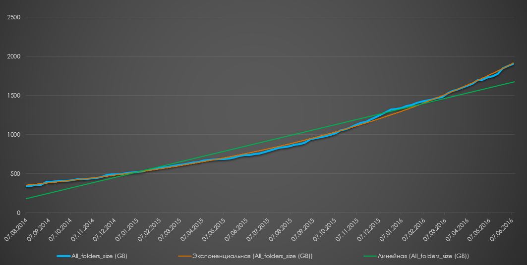 Профиль | Отправить PM | Цитировать Foreigner, Идея интересна, но мне на выходе нужно получить большое кол-во точек за неопределенный заранее промежуток времени, для детального изучения графика роста объема данных и предсказания планируемого объема при таких же темпах роста, через год, два или три. Если выборка маленькая, то грфик будет "скакать" в зависимости от выбранного периода.