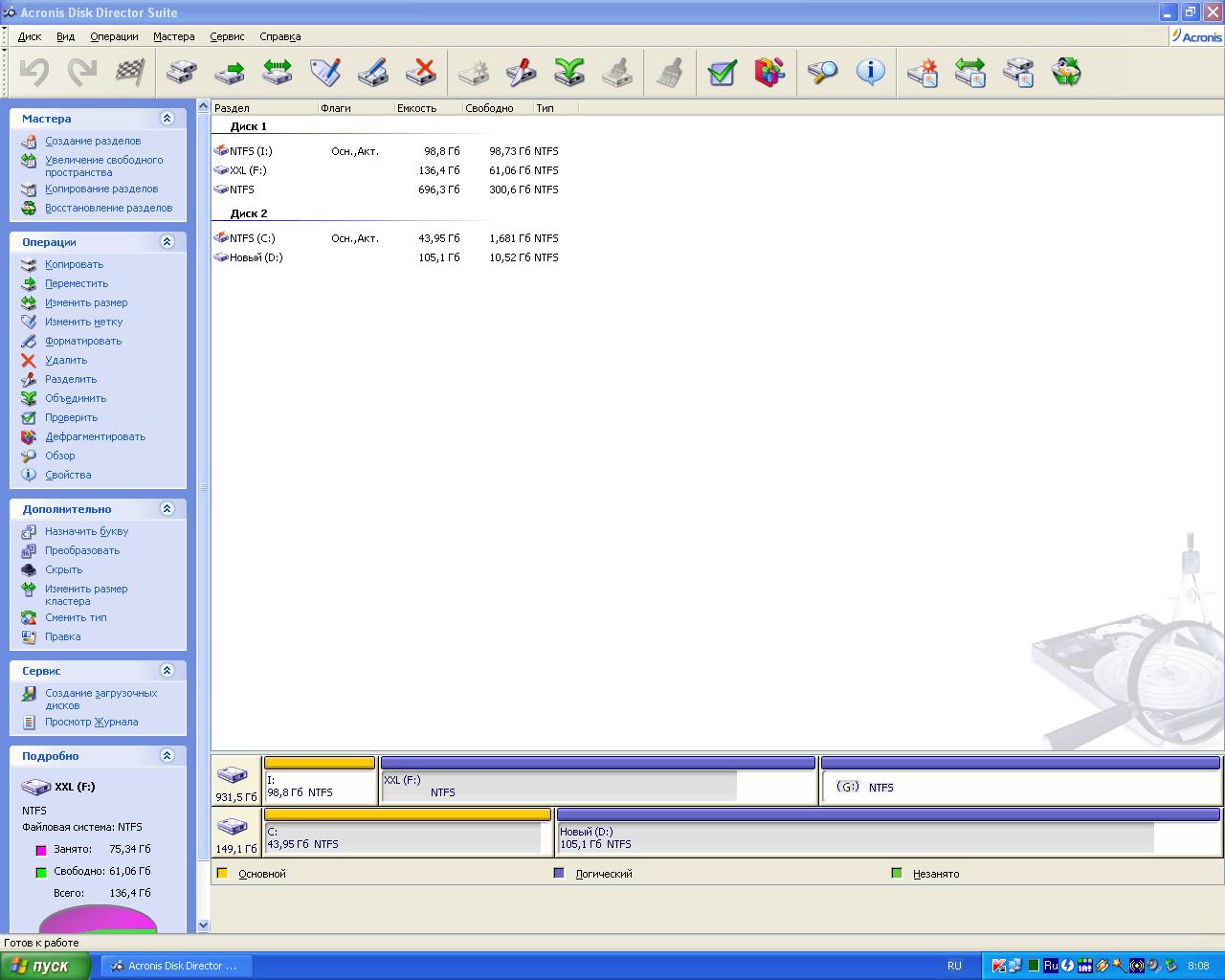 Здравствуйте, я решил объединить два логических раздела в один общий. У меня были разделы: диск F: объемом 500 GB где было свободно около 100 GB свободного места, а остальное занимала информация и раздел G: объемом 386 GB который был абсолютно пуст. Для объединения я воспользовался программой Acronis Disk Director Suite 10 версия, операционная система Windows XP, файловая система дисков NTFS.