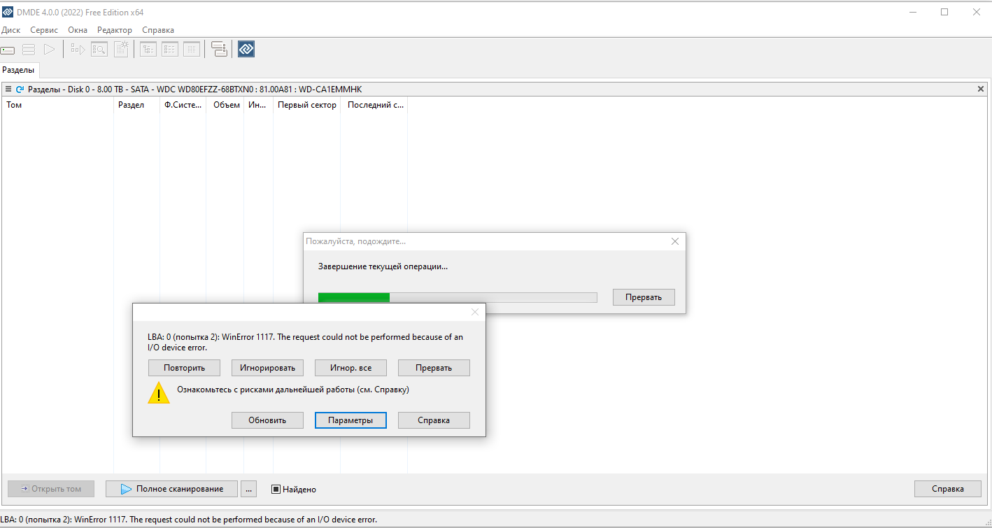 LBA: 0 (попытка 2): WinError 1117. The request could not be performed because of an I/O device error.