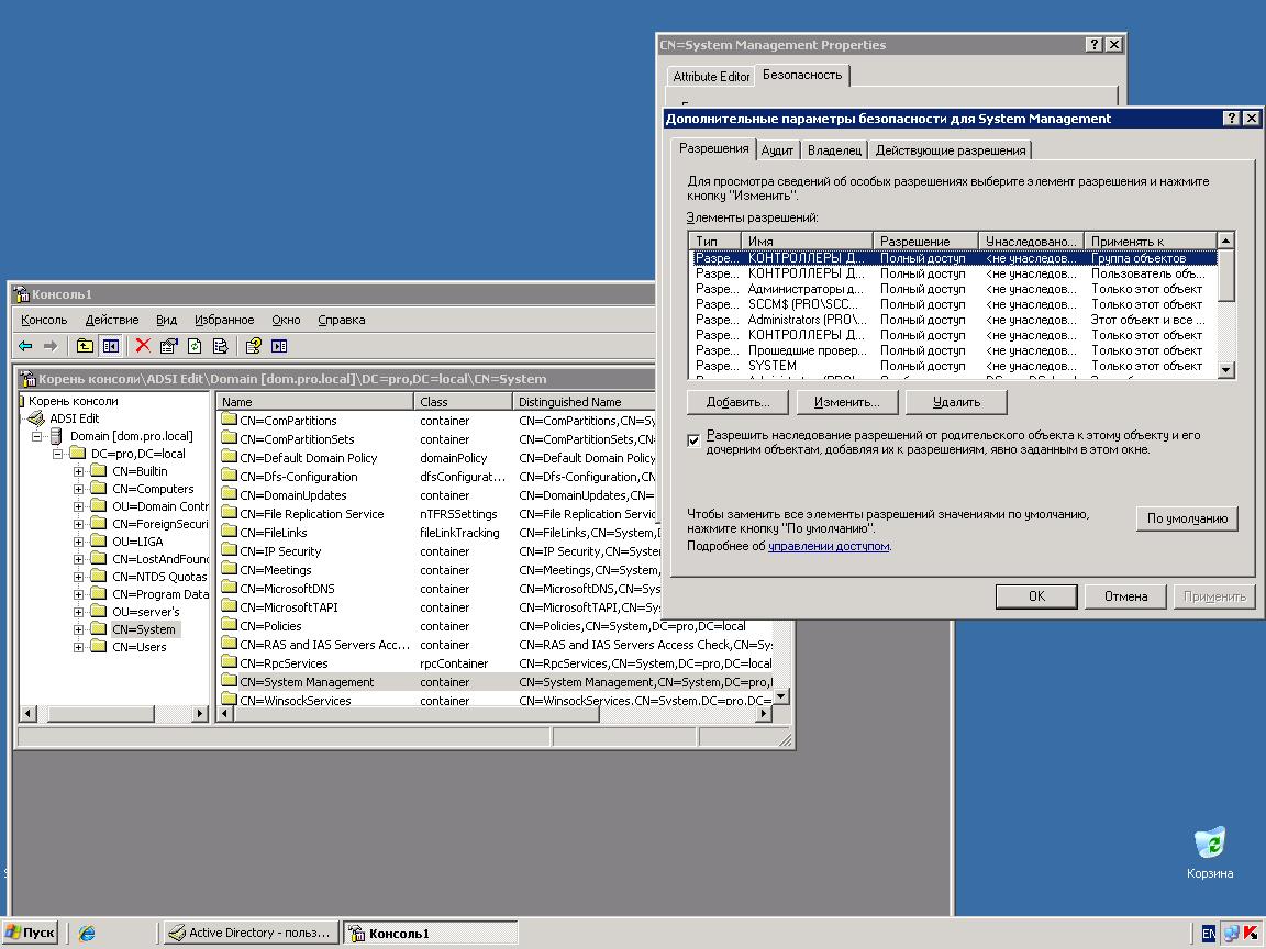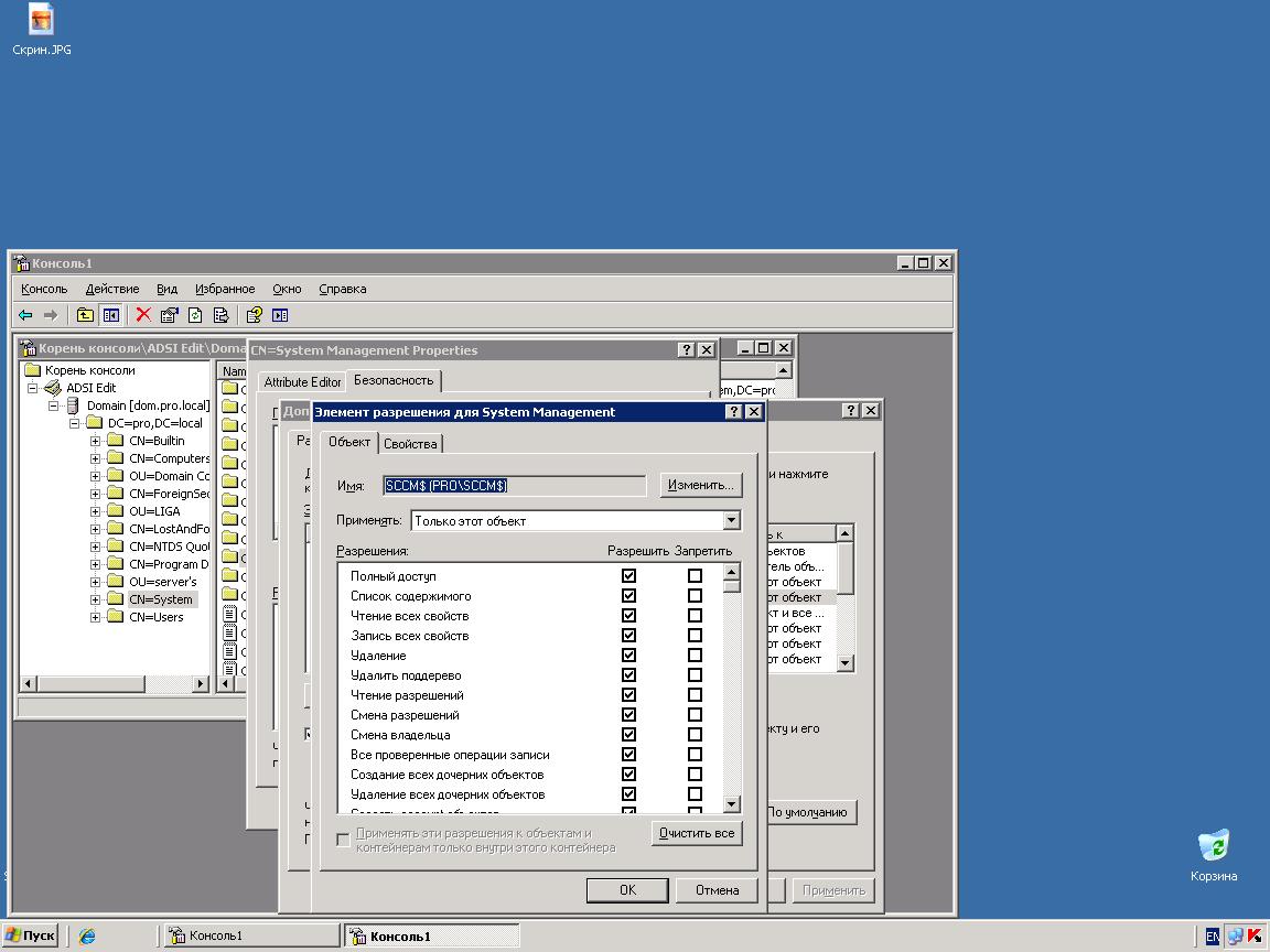 Профиль | Отправить PM | Цитировать Покажите скриншет для настроек безопасности AD->Sysmtem Management->Вкладка безопасность->Дополнительно->Выбираете учетную запись сервера SCCM-> Изменить.