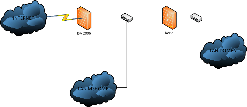 Как сделать сеть с двумя фаейрволами ISA и Kerio Примерная схема сети на рисунке. Internet необходим всем сетям, Как делать проброс с кери в ису что бы юрез сог полесть в мир не пойму ни как На входе в инет стоит Isa 2006, за ней маршрутизатор на котором есть 5 машин в MSHOME. За ними Kerio и за ним уже сеть но уже с доменом Какие предложения есть |