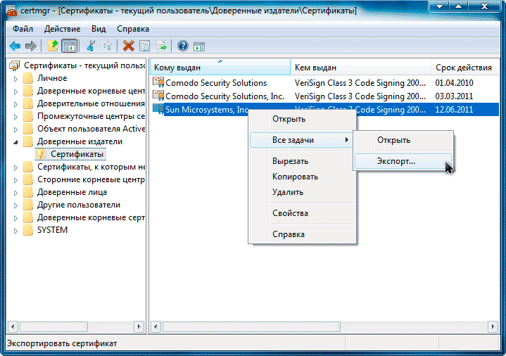 Для этого надо на рабочей системе с установленной VirtualBox экспортировать сертификат, а при установке сначала добавить его в систему, а потом запустить установку. Тогда система не будет задавать вопросов. Для экспорта надо открыть оснастку certmgr.msc (см. рисунок) сохранить файл и потом добавить его в установку вместе с утилитой, ну и добавить команду что я привёл выше непосредственно перед запуском установщика. |