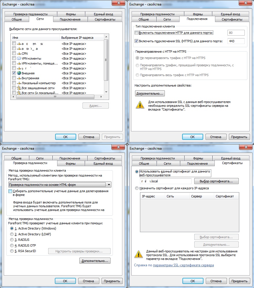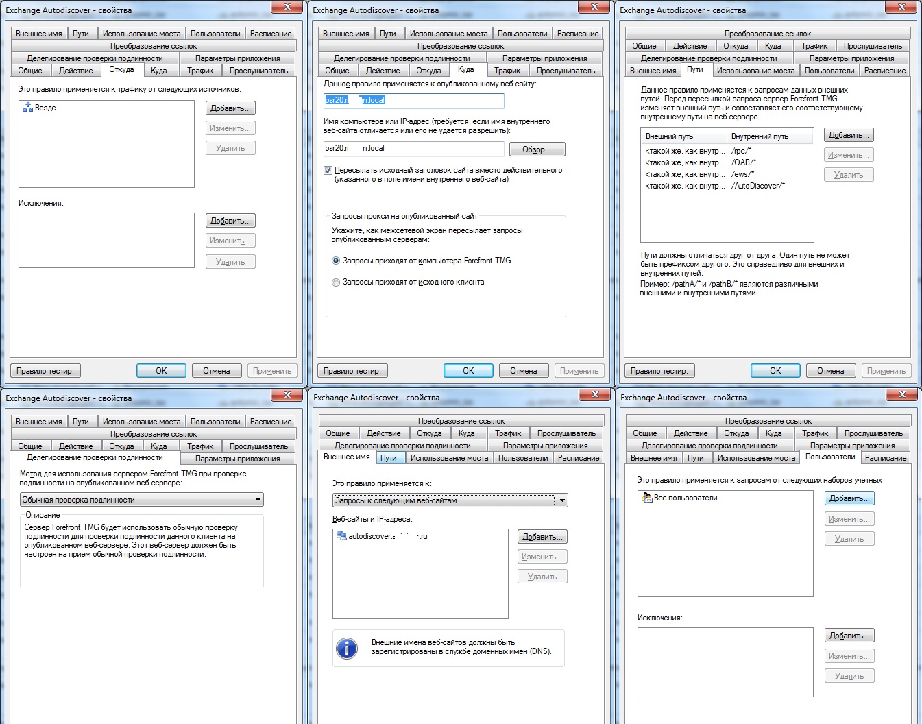 прослушиватель: сети: внешняя, порт 443, сертификат domain.local, методы проверки подлинности: FBA with AD, Всегда проверять подлинность: нет. правило: откуда: везде, куда: excahnge.domain.local, Делегирование проверки подлинности: обычная проверка подлинности. В TMG создано 4 правила публикации: ActiveSync, OWA, AnyWhere и Autodiscover. Последние два отличаются "внешними именами" : у AnyWhere - mail.domain.ru, у autodiscover - autodiscover.domain.ru; для них доступ "все пользователи". |