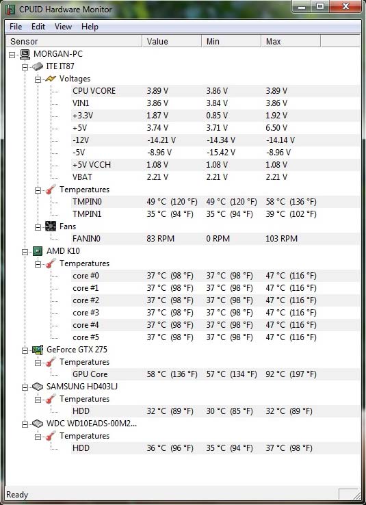 AMD PhenomII x6 1055T Asus M4A88T V-EVO Inno3d GTX 275 Chieftec CFT-700-14C 700W 2*2 Gb DDR3 1333 OCZ Gold Edition HDD Samsung 400 Gb 7200rpm HDD 1.0TB WD CaviarGreen WD10EADS Aerocool Vx-9 Pro LE Сегодня примерно после часа игры в WoT утилита AI Suite II выдала предупреждение "Warning! +12V Voltage 5,341V". Такого раньше никогда не случалось При этом компьютер работает стабильно, признаков каких-либо неисправностей не заметно в аттаче скриншот предупреждения, показания утилиты HWMonitor и сенсора в AI Suite II собственно вопрос вот в чем... мне следует беспокоиться, что скоро нагнется БП или еще что то? |