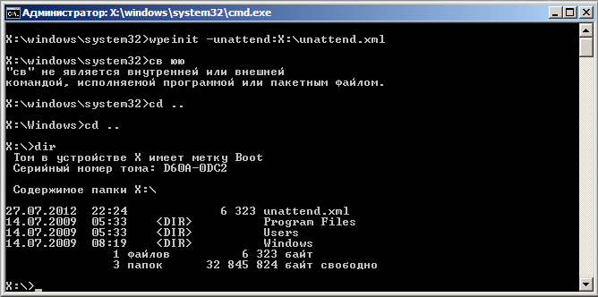 Профиль | Отправить PM | Цитировать Возникла проблема. Есть образ настроенной "семерки". Хочу сделать его авторазвертывание через Windows PE, но не получается. Пробовал через startnet.cmd - не запускается diskpart со сценарием. Пробовал через unattend.xml - wpeinit его просто игнорирует. Возможно я ошибся в файле ответов, т.к создаю его 1й раз