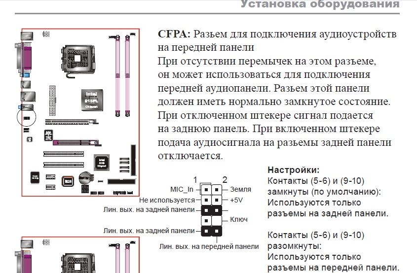 Pin Signal Name Function 1 AUD_MIC Front Panel Microphone input signal Выход микрофона на переднюю панель 2 AUD_GND Ground used by Analog Audio Circuits Земля, масса, минус - как хотите ![]() 3 AUD_MIC_BIAS Microphone Power Что то связанное со смещением звука на микрофоне, надеюсь кто то более точно сообщит. 4 AUD_VCC Filtered +5 V used by Analog Audio Circuits 5 вольт питания для звука 5 AUD_FPOUT_R Right Channel Audio signal to Front Panel Выход правого канала на переднюю панель 6 AUD_RET_R Right Channel Audio signal to Return from Front Panel Вход правого канал на переднюю панель 7 HP_ON Reserved for future use to control Headphone Amplifier Зарезервировано для использования в будущем 8 KEY No Pin Бестолковый контакт ![]() 9 AUD_FPOUT_L Left Channel Audio signal to Front Panel Выход левого канала на переднюю панель 10 AUD_RET_L Left Channel Audio signal Return from Front Panel Вход левого канала на переднюю панель Звук - что, куда? подключение: