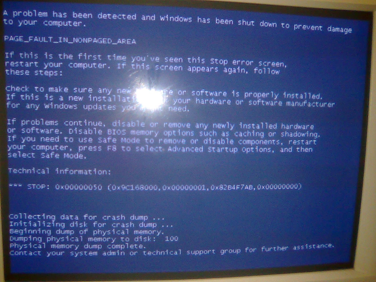 Профиль | Отправить PM | Цитировать Прошу разъяснить в чем проблема с ошибкой STOP:0x00000050 (0хА0Е6С000, 0х9F1B5000, 0x00000001, 0x82B227AB, 0x00000000). Симптомы: стоит ОС Win7 (детально описать не могу, система не своя) и 2 физических диска. Грузится нормально с диска С:, при обращении к Д: выскакивает BSOD с указанными параметрами (держится примерно 3 секунды), далее система уходит на перезагрузку и загружается уже нормально. И так по кругу при обращении к Д:. Грешу на сам диск или не так? Спасибо