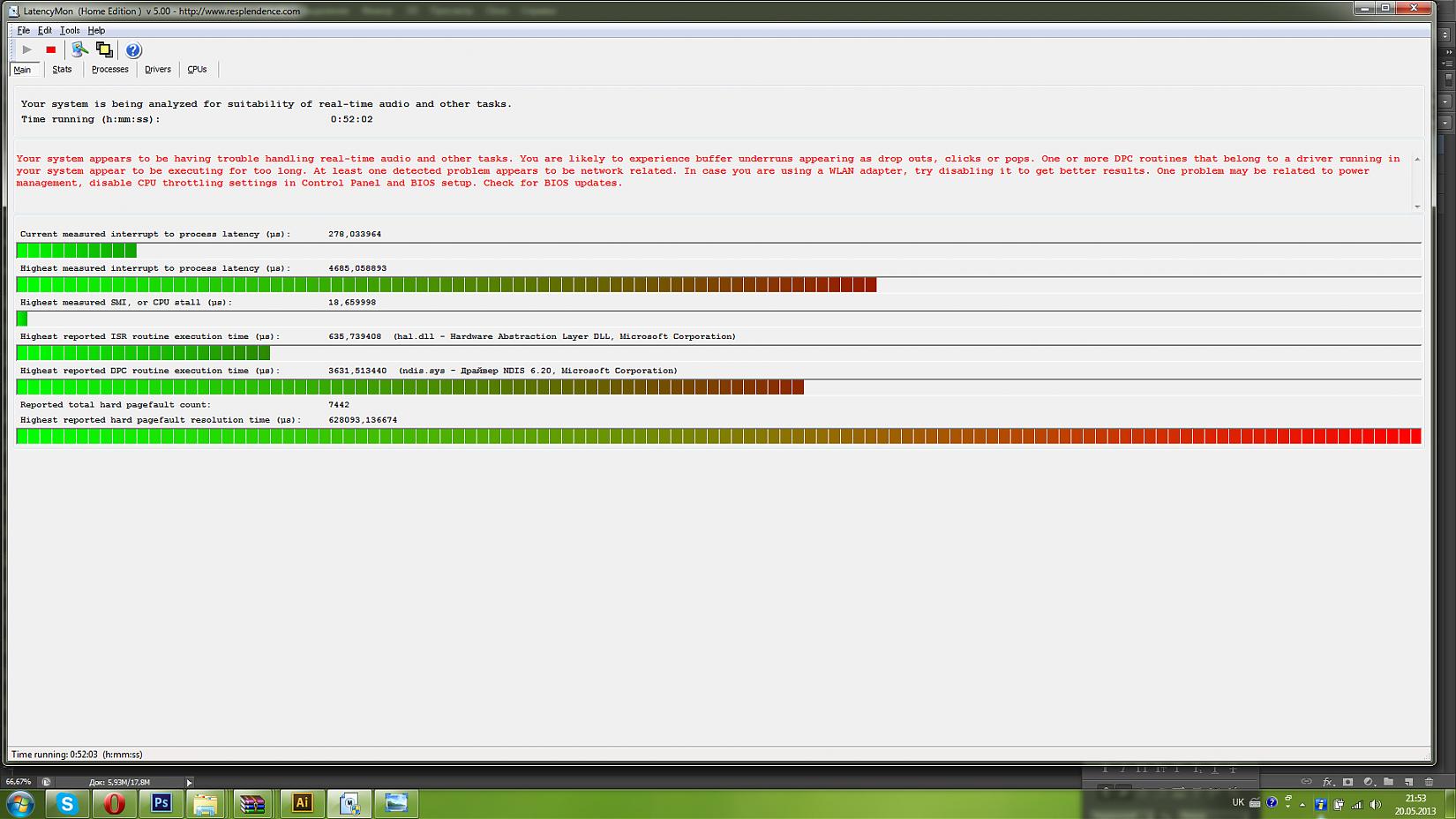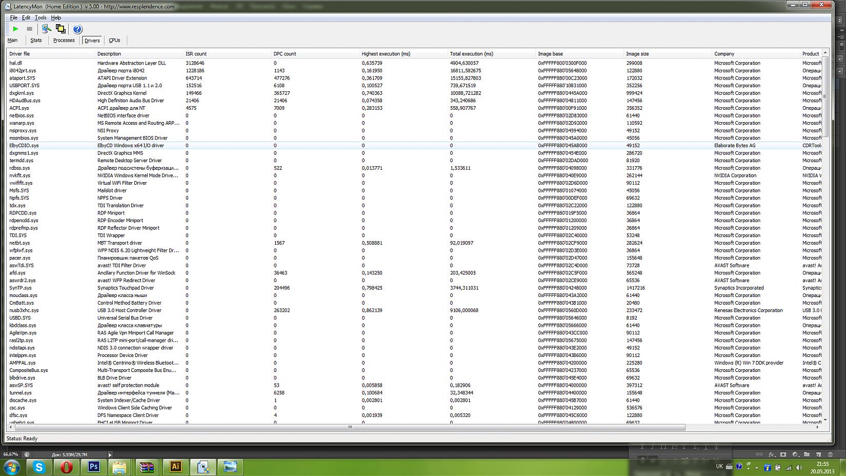 Перед использованием прочитайте документацию. Для завершения мониторинга нажать кнопку Stop. После зайти на все вкладки (Stats, Processes и Drivers) и посмотреть результаты. На вкладке Stats скопировать отчет целиком (в текстовом виде). На вкладке Processes задать сортировку по столбцу Pagefaults. На вкладке Drivers - по столбцам ISR и DPC. |