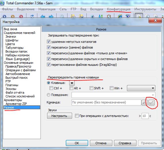 Профиль | Отправить PM | Цитировать chek, попробуйте меню "конфигурация"->"настройки"->"Разное"->"Переопределить горячие клавиши", в списке команд выбрать "cm_FocusCmdLine" (вбейте в фильтр, чтобы не искать), назначить удобное для вас сочетание клавиш. У меня оказалось необходимым нажать на зеленую галочку, иначе настройки не сохраняются (нажатия на "Ок" недостаточно)