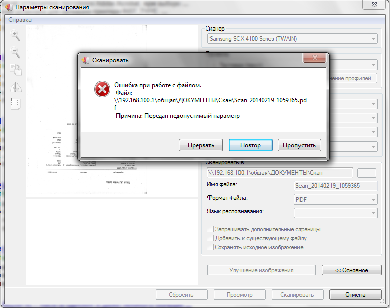 Драйвер - SmarThru выдаёт ошибку при сохранении в отсканированного изображения в сетевую папку