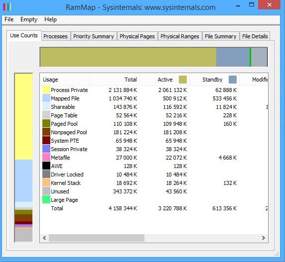 1. Запустите RAMMap и покажите скриншот вкладки Use Counts во время глюка.