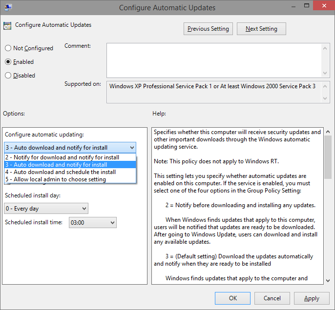 gpedit.msc - Computer configuration - Administrative templates - Windows components - Windows Update - параметр Configure Automatic Updates - установите его значение в Enabled и настраивайте так же как и в GUI настраивали. Это не разблокирует настройку получения обновлений в панели управления, но позволит вам настроить так как хотелось. |