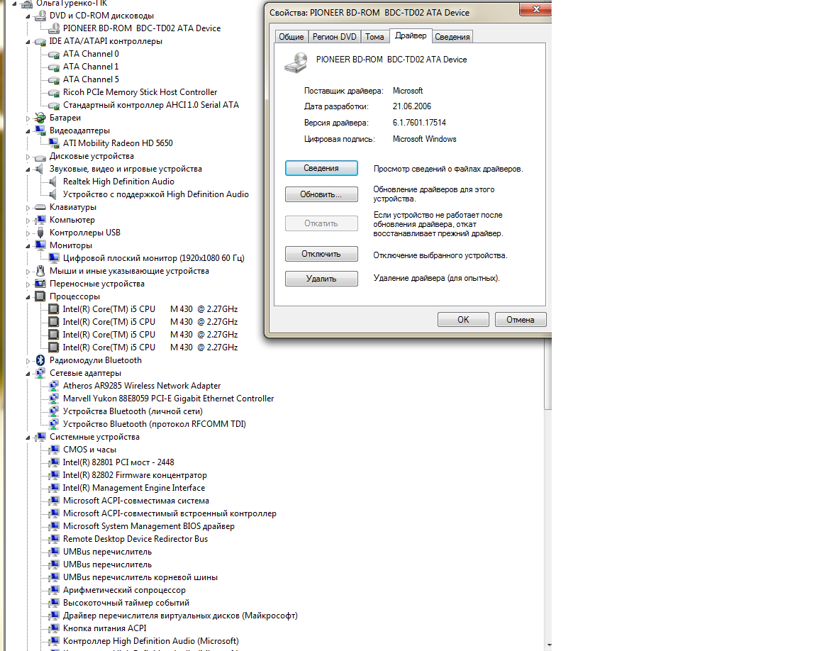 Добрый день! Нужна Ваша помощь, сам уже сломал голову , но причину так и не нашел! На ноутбуке SONY VPCEB1Z1R полностью переставил систему, т.к. за 4 года использования накопилось много хлама. После установки всех программ и драйверов все работает как и положено, кроме привода pioneer bd-rom bdc-td02 ata device. Он напрочь отказывается читать ЛИЦЕНЗИОННЫЕ BD диски (кстати привод читает все остальные форматы) ни на одном из установленных проигрывателей! причем если я запускаю скачанный в файл BD диск он проигрывается! Т.е. все кодаки установлены. Есть подозрения что драйвера которые подцепила система (Microsoft 21/06/2006 6.1.7601.17514) не совсем корректно читаются, родные я не нашел совсем!