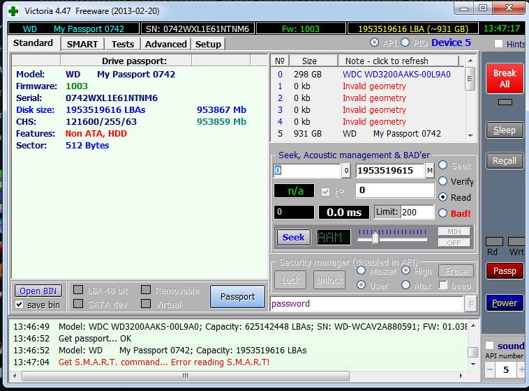Профиль | Отправить PM | Цитировать Здравствуйте форумчане, Такая проблема имеется внешний WD10TMVW-11ZSMS5 , забит важной инфой. слетела ФС, ntgthm RAW, из под винды не форматируется, акронис и парагон ругаются на ошибку ввода вывода устройства. Подозреваю контроллер загнулся. Подпаивать сата крайний вариант (и то не знаю поможет ли). Есть еще какие- нибудь варианты? скрины виктории и ее смарта прилагаю, управление дисками и DMDE (кстати все время ошибки при любой проверке)