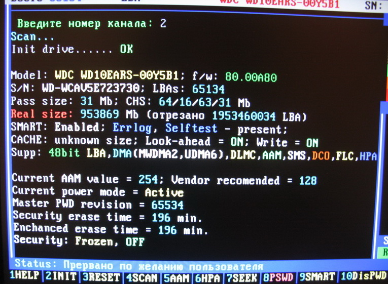 Паспорт естественно, запрашивал, как и СМАРТ. Диск был виден, но паспорт правильно не отображался, как, впрочем, и у нескольких исправных винтов, которые я подключал для пробы. Видимо, надо было играться в биосе с режимами контроллера, чего я не сделал. В результате быстрее оказалось поставить ХРю и из-под нее все быстро решилось с помощью HDD Capacity Restore Tool. ![]() |
