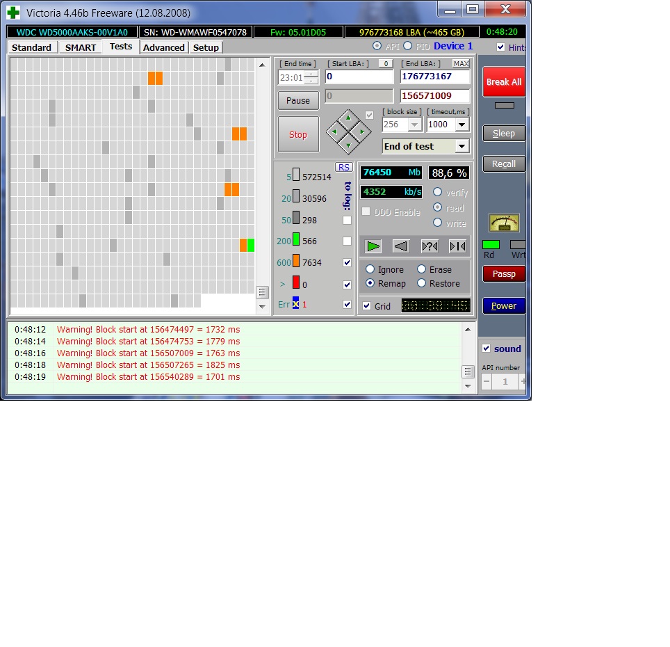 Проведите пару раз полное стирание винту, инфа с него "улетит" ес-нно ж. Потом сделайте скан поверхности и в итоге снимите СМАРТ ещё раз. Интересуют показатели аттрибутов 05, 196-198. Если они станут =0, то винтом можно и дальше пользоваться. Но платку с гермоблока винта я б всё-таки открутил и контактики порыжевшие/потемневшие почистил бы ластиком. kvn-b, Ваш винтик относится к WD Tornado давно снятому с производства. Ему б сделаеть тож самое, что я посоветовал topol11. Потом просмотреть СМАРТ. Вообще эти модели прекрасно ремонтятся техноформатом в соотвествущем ПО. Если простой способ лечения не поможет винту - попробуем обдумать другой вариант лечения вашего винта. |