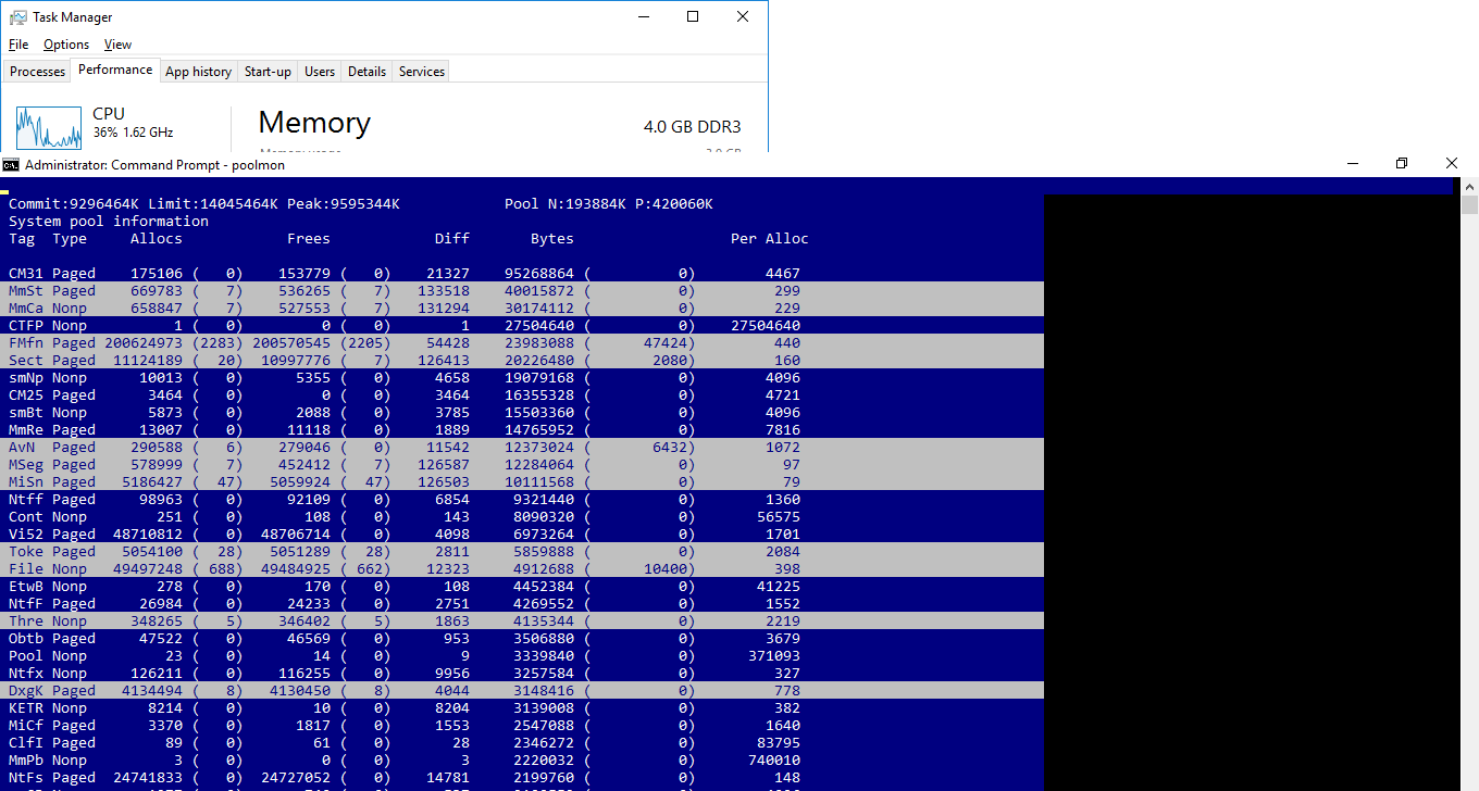 1. Запустите RAMMap и покажите скриншот вкладки Use Counts во время глюка. 2. Если утечка в Nonpaged Pool или Paged Pool - причина в каком-то из драйверов. Чтобы его определить: