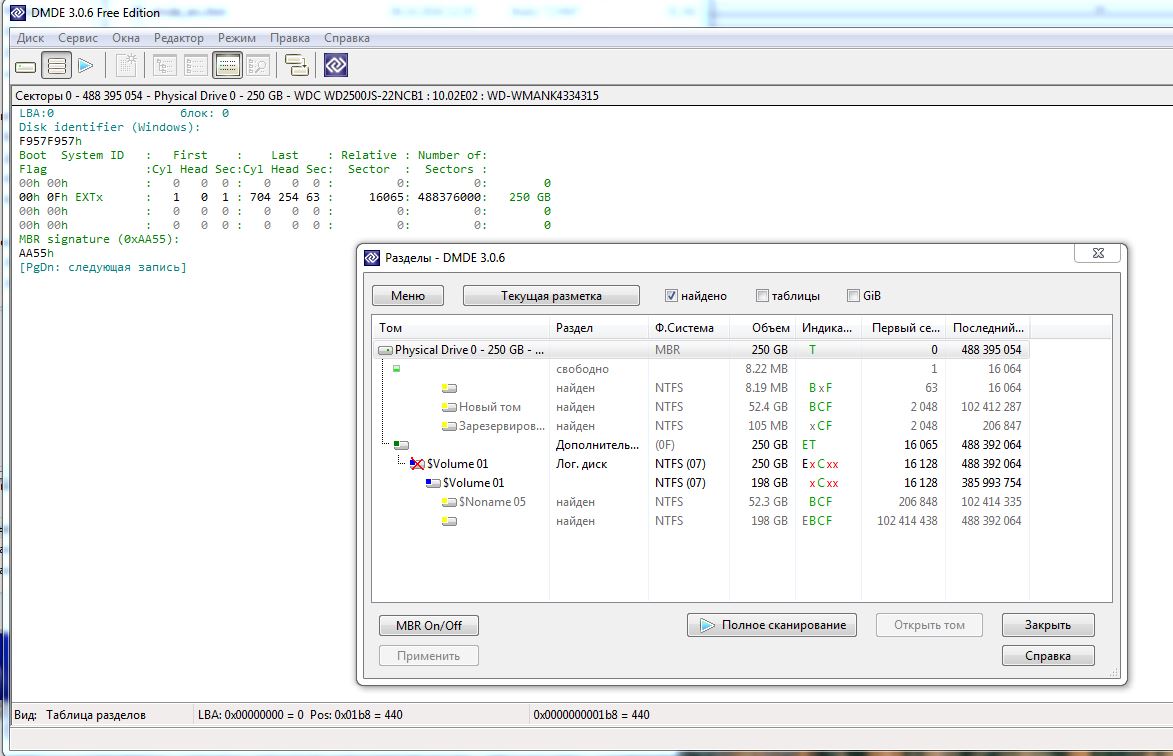 Профиль | Сайт | Отправить PM | Цитировать TURIST1987, попробуй так - Восстановление удалённого раздела с помощью программы DMDE для Windows - по примеру разберешься. Главное, правильно определи нужные разделы, по размерам. Впрочем, если сделаешь ошибку - на последнем этапе создается резервный файл, кот. позволит вернуться к исходной конфигурации и попробовать другие восст. разделы.