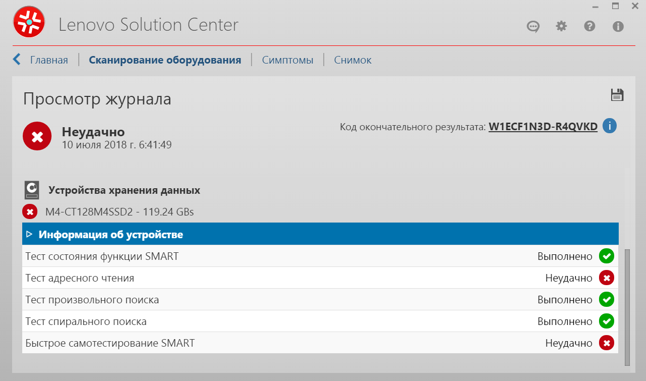Посмотрел другими - MHDD и HDTune, там чтение нормальное, 1 бэд правда есть. Видимо на нем HDDScan и спотыкалась и далее показывала всё бэдами. Но тем не менее самотестирование SMART не проходит.