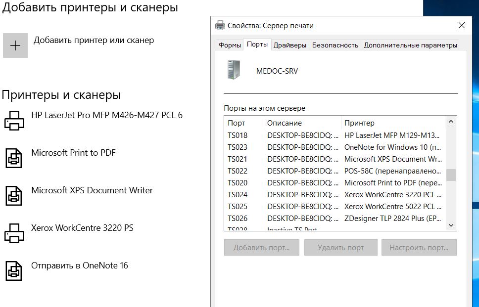 В свойствах сервера печати в списке проброса портов видно что эти принтеры проброшены, а вот в списке принтеров их почему то нет