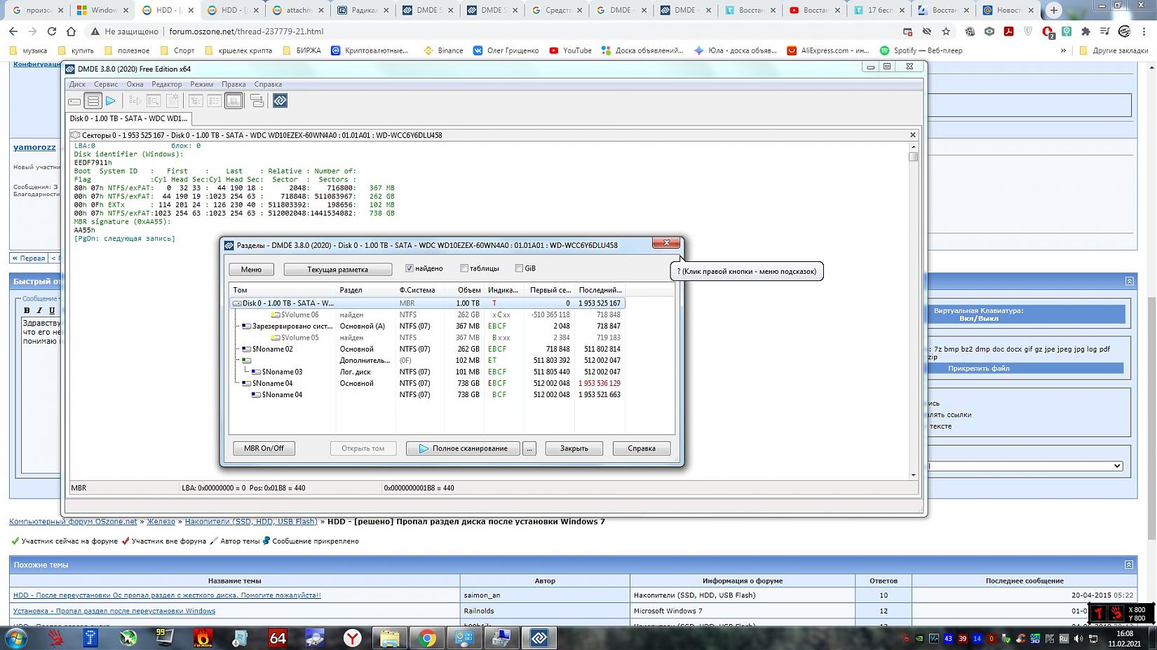 HDD - После переустановки Ос пропал раздел с жесткого диска. Помогите пожалуйста!! saimon_an Накопители (SSD, HDD, USB Flash) 10 20-04-2015 01:22