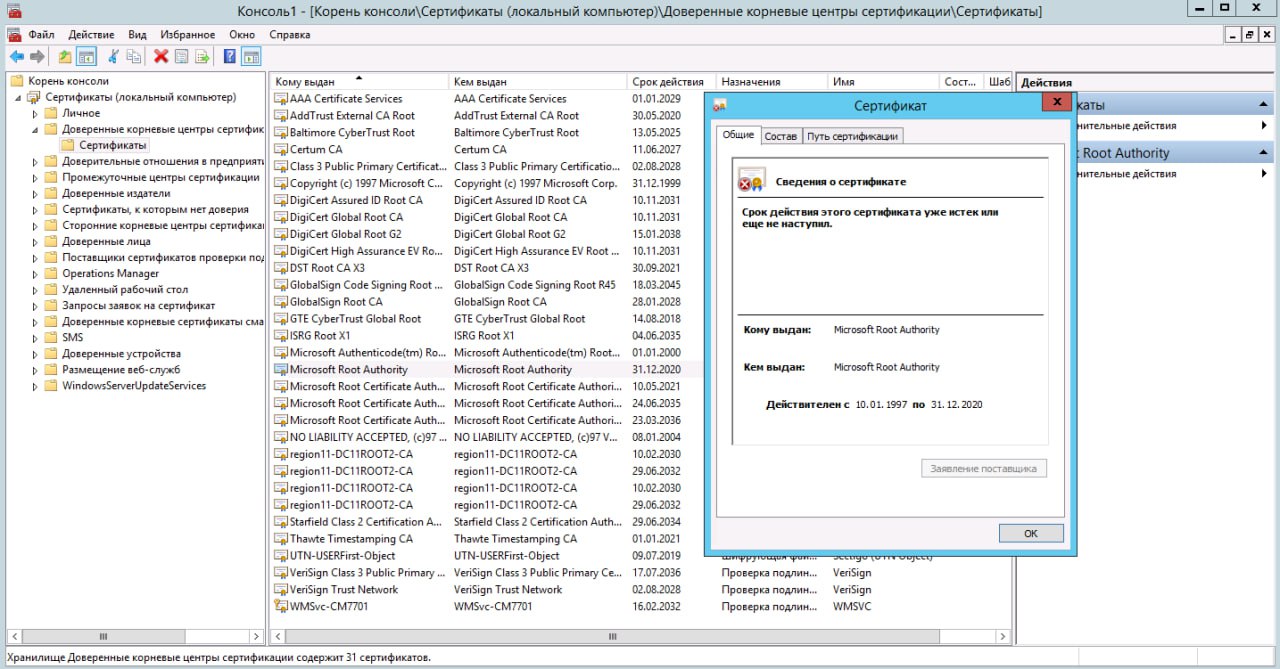 когда отозван не работает, а когда просто просрочен, все нормально. тоже самое с Microsoft Root Certificate Authority См скриншоты Если же ставить повершеллом, типа certutil.exe -generateSSTFromWU c:\PS\roots.sst $sstStore = ( Get-ChildItem -Path C:\ps\rootsupd\roots.sst ) $sstStore | Import-Certificate -CertStoreLocation Cert:\LocalMachine\Root то все в порядке! |