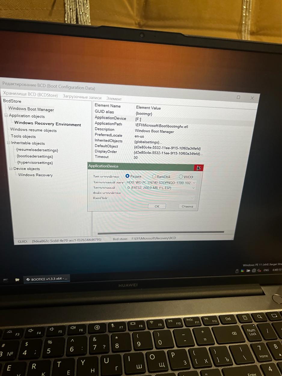 Здравствуйте. Имеем ноут huawei d16 2023 i9 16gb ssd 1tb. Купил для работы тк одна прога по работе весит около 500 гигов, а их три. Решил купить еще один ssd 2tb и клонировать на него все разделы. Пробовал и посекторное клонирование и из под винды и с загрузочной флешки результат всегда один. Не корректно работает huawei recovery (smart reset) а именно после клонирования все грузится запускается. Нажимаю f10 перед загрузкой, потом рекавери, все проходит успешно. Но при перезагрузке выдает синий экран с ошибкой 0xc000000e. Но при замене ssd на родной все отрабатывает штатно. Сравнивал разделы с родным ssd все как и у родного все они gpt. Менял ssd на другой новый. Ситуация та же. В чем может быть засада. Неделю ложусь в 4 утра, голова не варит уже. Как восстановить полный заводской функционал?