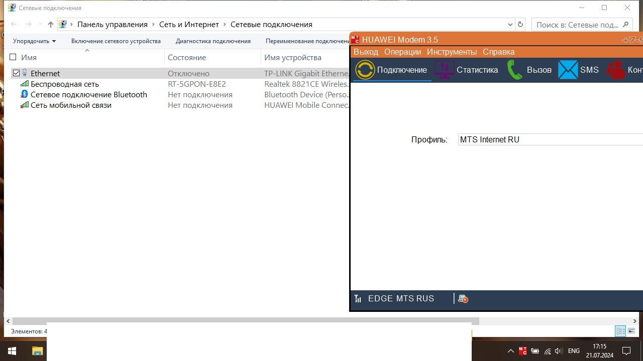 В ноутбук вставлен мой старенький модем МТС Huawei e171, который я использую лишь для SMS и в очень редких случаях чтоб подключиться к МОБИЛЬНОМУ ИНЕТУ если домашний (ростелеком) не работает...(однако, я подчеркну, что для получения и отправки sms -никакой интернет НЕ нужен). Модем всегда показывает сигнал сотовой связи, в левом нижнем углу программы МТС коннект полная антенна и надпись EDGE MTS RUS и к слову сказать если я ОТКЛЮЧАЮ WI-FI, то в МТС ничего не меняется, так-же полный сигнал антенны...ну иногда может 2-4 деления остаётся, но в основном полная...Но как только я подключаю Ethernet, то модем превращается в "кирпич", вообще пропадает антенна, надпись и EDGE MTS RUS. Стоит мне разорвать соединение с Ethernet (панель управления - Сеть и интернет -управление сетями и общим доступом -Изменение параметров адаптера - Ethernet Отключить...то всё прекрасно...появляется сигнал EDGE MTS RUS