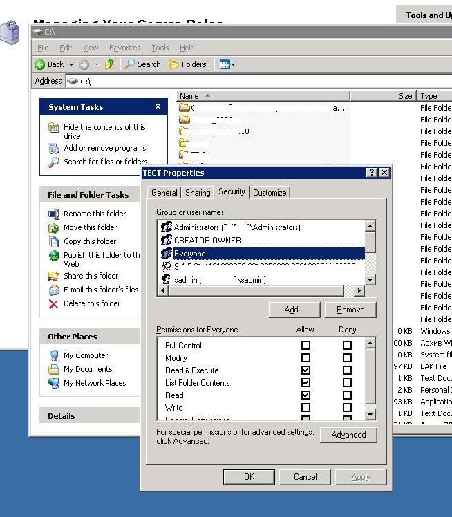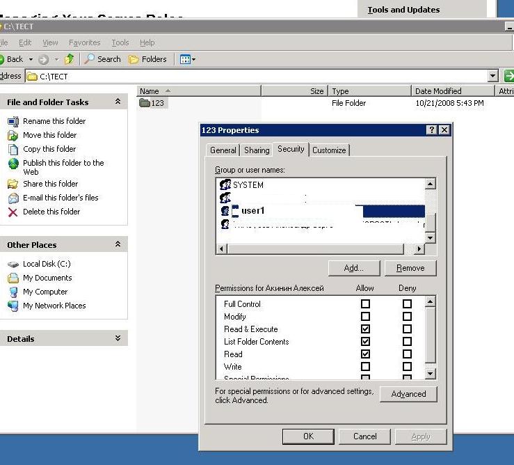 объясните пожалуйста...стыдно конечно спрашивать но пока не могу понять... ситуация такая: сервер вин 2003, создаю папку ТЕСТ, в ней создаю подпапку 123 Расшариваю ТЕСТ и ставлю права: чтение для всех на папку 123 в безопасности добавляю пользователя user1, права: полный доступ воттть и теперь когда user1 заходит в папку 123 у него нет полного доступа, а только права на чтение =(((( не могу понять по идеи делаю всё правильно. |