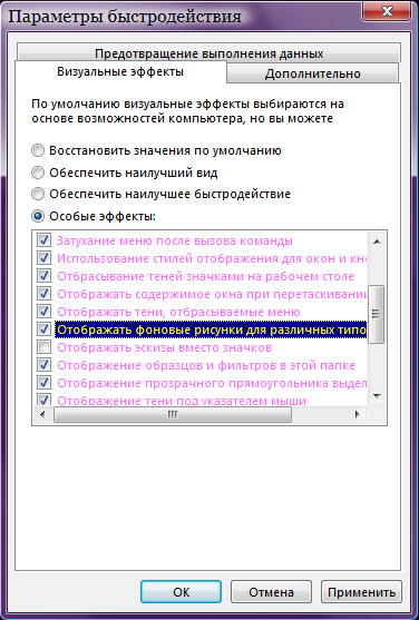 Почему-то никак не удаётся сделать включение отображения фоновых рисунков для различных типов папок в Висте!