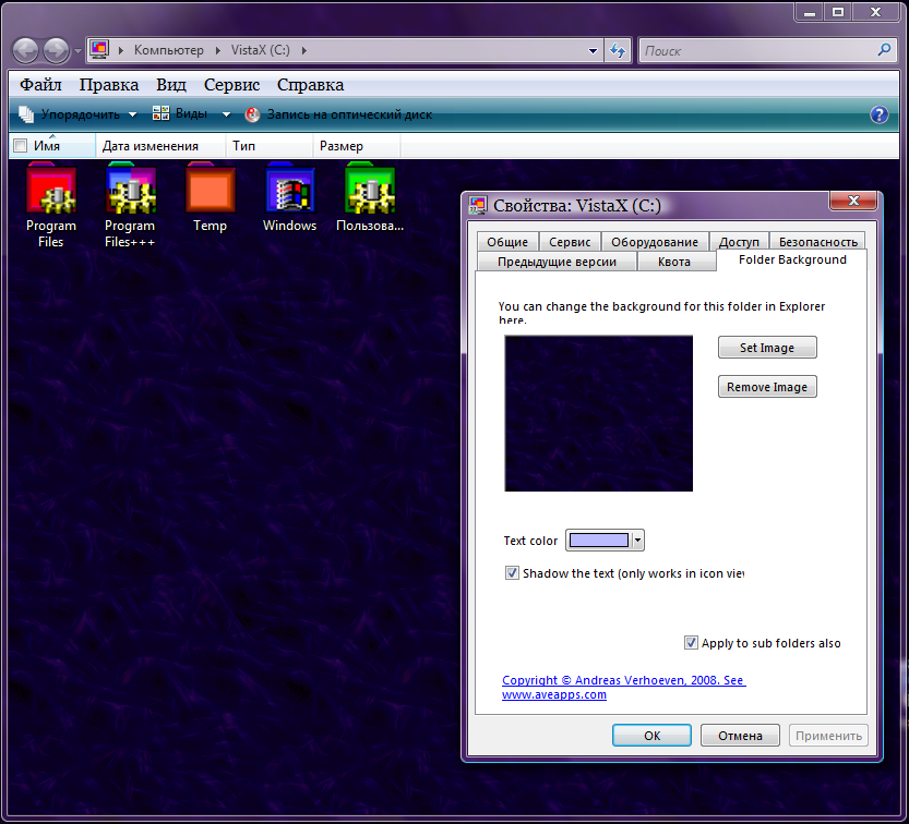 Vista Folder Background: Set Your Desired Wallpaper as Folder Background in Windows Vista Но вариант решения получился какой-то геморный! Получается, что в файл desktop.ini прописывается для Висты отдельная настройка для фона, отличная от XP! Что по логике вещей - не есть гуд!!! Ну да ладно! В некотором смысле - это терпимо! Так что можно считать тему закрытой, ежели конечно кто-нибудь не предложит что-нибудь получше! |