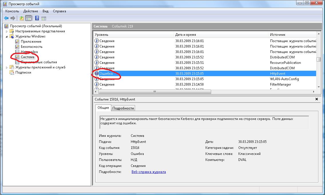 Это последняя ошибка, которая которая осталась, просто сегодня журналы чистил(( Имя журнала: System Подача: Microsoft-Windows-HttpEvent Дата: 30.03.2009 23:15:05 Код события: 15016 Категория задачи:Отсутствует Уровень: Ошибка Ключевые слова:Классический Пользователь: Н/Д Компьютер: DVAL Описание: Не удается инициализировать пакет безопасности Kerberos для проверки подлинности на стороне сервера. Поле данных содержит код ошибки. Xml события: <Event xmlns="http://schemas.microsoft.com/win/2004/08/events/event"> <System> <Provider Name="Microsoft-Windows-HttpEvent" Guid="{7b6bc78c-898b-4170-bbf8-1a469ea43fc5}" EventSourceName="HTTP" /> <EventID Qualifiers="49152">15016</EventID> <Version>0</Version> <Level>2</Level> <Task>0</Task> <Opcode>0</Opcode> <Keywords>0x80000000000000</Keywords> <TimeCreated SystemTime="2009-03-30T20:15:05.231Z" /> <EventRecordID>29564</EventRecordID> <Correlation /> <Execution ProcessID="4" ThreadID="52" /> <Channel>System</Channel> <Computer>DVAL</Computer> <Security /> </System> <EventData> <Data Name="DeviceObject">\Device\Http\ReqQueue</Data> <Data Name="SecurityPackage">Kerberos</Data> <Binary>000004000200300000000000A83A00C00000000000000000000000000000000000000000000000000E030980</Binary> </EventData> </Event>