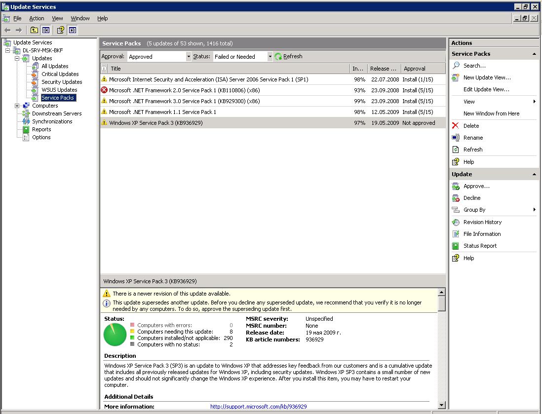 через всус их не забираю, слишком много леватории по объёму получается.. чтож MS для корпоратива выпустил новый сп спустя год? ps to Diesel315 Под значком "i" в описании обновления написано, что обновление отменяет некоторые старые обновления, но прежде чем их отклонить, надо сначала проверить не нужны ли они другим компьютерам, т.е. старые обновления принимаются и устанавливаются тем "кому оно надо", а потом приминяются новые обновления, иначе часть обновлений не установлена и не факт что сп3 содержал эти обновления, даже если после него они не нужны.... pps по сабжу могу сказать, что так не делается, списки всус надо было редактировать, иначе если имя компьютера осталось в списке, то после переустановки системы с тем же именем, как понять что компьютер действительно снова подкл. к всус? Нужны логи с клиентов. Если вы считаете что возможно использование одного имени, то скорее всего появился бы второй компьютер, т.к. система редко обращает внимание на имя, а использует другие идентификаторы... Так же попробуйте адрессовать компьютер в группу через GP, а не вручную на всус... Ну и сто раз уже писал: wuauclt.exe /resetauthorization /detectnow Просто detectnow не всегда работает... |