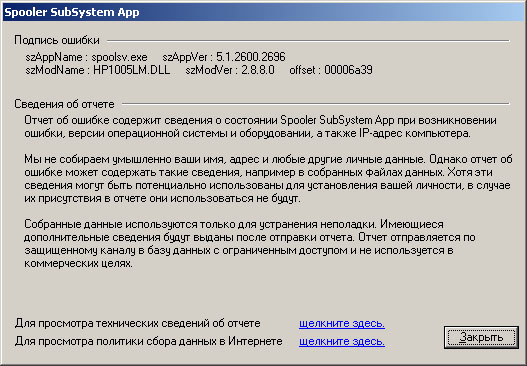 При загрузке все работает нормально, при печати несколько страниц выводит без проблем, а через некоторое время, видимо в зависимости от настроения компа он мне начинает выдавать то одну то другую ошибку: 1) Ошибка первого "типа": Иногда, при попытке отправить на печать вылазит сообщение: spoolsv.exe - ошибка приложения "ris1.jpg" (все картинки прикреплены ниже), если нажать в ней "Отмена" то тут же появляется еще одно сообщение об ошибке "ris2.jpg", если же и там нажать "Отмена" то больше ошибка не появляются, но все принтеры пропадают на две-три минуты, после чего они вновь появляются и все работает в штатном режиме как будто ничего и не было... 2) Ошибка второго "типа": Так же иногда, при попытке отправить на печать вылазит сообщение об ошибке "ris3.jpg" (Spooler SubSystem App - Обнаружена ошибка. Приложение будет закрыто. Приносим извинения за неудобства.). Что показано в данных содержащихся в отчете видно на "ris4.jpg", а технические сведения об отчете на "ris5.jpg" Обе эти ошибки появляются без какой-либо закономерности, т.е. печатаю нормально несколько страниц а потом захочет вылезет одна из этих ошибок, перезагружусь, опять попечатаю нормально какое то время и вылазит или эта же ошибка или другая... И при первой и при второй ошибке, в панели управления пропадают все принтеры, только при первой ошибке они через какое то время снова появляются как будто так и было, а при второй ошибке они исчезают и появляются только после перезагрузки. Буду благодарен за любые рекомендации и советы (кроме конечно выбросить комп или принтер). Чуть не забыл, точнее забыл но вовремя вспомнил, принтер: HP LaserJet M1005 P.S.: Дрова переустанавливал уже не один десяток раз, наверное всеми возможными способами... |