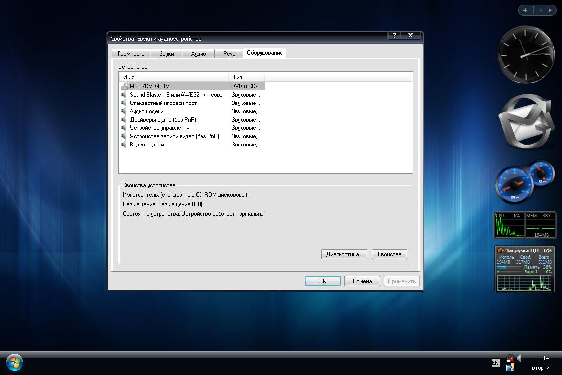 [решено] Свойства: Звуки и аудиоустройства -> Оборудование