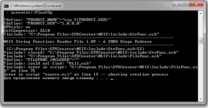 соберите следующие файлы в архив и прикрепите к вашему сообщению, посмотрим в чем проблема <Папка SFX Creator>\projects\ваш файл проекта.ini <Папка SFX Creator>\NSIS\Source.nsi <Папка SFX Creator>\NSIS\Include\SoftInclude.nsh <Папка SFX Creator>\NSIS\Include\K.A.V._PRE_Function.nsh <Папка SFX Creator>\NSIS\Include\K.A.V._POST_Function.nsh По таким вашим сообщениям Цитата wakeup.wakeup: