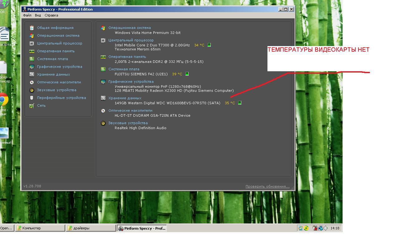 РИС.1Артефакты(что то похожее на мой) сине-розовы полосы Моему ноутбуку FUJITSU-SIEMENS AMILO Pi 2530 почитай уже 8 лет.И ко всяким БСОДАМ за последние года 3 я привык, и они кое как лечились.Но сегодняшний «глюк» это жесть. сдесь файл дамп Эта была она ошибка 0x00000117 ….. Я начал делать различные «танцы с бубном» но ниче не помогало — и тут я подумал ,что дело в винде.Я преустановил ВИСТУ , но проблемма не решилась.Почитав на разных форумах различные поиски решения этих проблем-я начад действовоать.. .И так что я делал — дефрагментация,поиск на вирусы, отключение апаратного ускорения во флеш плеере,проверка дисков на ошибки,отключение «индексирования диска для более бысрого поиска»,меняем план электорпитания с « высокой производительности» на сбалансированный режим, умньшил управление питания процессора(максимальное состояние)до процентов 80.. .Но это все цветочки -а что? Проблема в видео драйвере? Начнем тогда скачиваем последние с офф.сайта -ну что вроде установились ,а нн.нет -каталист контрол сентер теперь их не видит -ну да ладно ...может не будет глюков..зря ))) здравствуй опять синий экран...Ну что поищем именнно « каталист конторо сентер» для моей видео карты Ati radeon hd2300...А такое разве есть ? Скачиваем на ати автоматический поиск драйверов ,но там только новый драйвер..... МОЖЕТ Я НЕ ТАМ ИЩУ НУЖНЫЙ МНЕ КАТАЛИСТ??? ТОГДА ВОПРОС ГДЕ ВЗЯТЬ НУЖНЫЙ КАТАЛИСТ ПОД МОИ ОБНОВЛЕННЫЕ ДРАЙВЕРА??? А пока откат видеокарты к первоночальномы драйверу.......... А ну ка посморим мою видюху на перегрев...Раньше куллер работал как фен -еще просто после загрузки винды,а ща даже в игре и то еле шумит....А что ? Надо почистить от пыли? Конечно надо, разбираем ноут бук -включаем пылесос на выдов воздуха и поперли -пыли нет.А да еще и куллер от пыли спичкой со спиртом протрем.НО нет ,может и стало лучше ,но синиие экраны опять появились.....Что мешает кулеру разгоняться и крутиться очень быстро при больших температурах....Качаем море совта -но ни в аиде64, НИ в еверерсте, ни спесии,ни теч повер гпу ,ни MSIaftrerburner не показывают температур видео карты и ни обороты куллера(ставлю с разных прогах тесты видеокарты, тесты куллера -ИХ ТАМ КАК БУДТО НЕТ ,НЕВИДИМКИ ,--НЕ ТЕМПЕРТУРЫ НИ ОБОРотов/(да я знаю ,что видеокарта может обозночаиться как gpu) -хотя в «диспетчере устройств» видеокарта есть..А да температура процессора , жесткого диска ,системной платы и хранения данных есть . ВОПРОС :ВСЕ ЛИ ВИДЕОКАРТЫ И КУЛЕРРЫ ДОЛЖНЫ ОТОБРОЖАТЬСЯ В ТЕСТОВЫХ ПРОГАХ-...ИЛИ …..У МЕНЯ ПОЛЕТЕЛИ КАКИЕ ТО ДАТЧИКИ???? А да есть еще прога speed fan -регулировать обороты куллера-качаем,ставим - и опа все зависает и приходиться только вытащить вилку из розетки ,а потом снести эту прогу.....А еще riva tuner -ДА делаем там все как надо ставим в fan/ auto fan speed control ставим цифру 3 , но в треугольничке « дополнительная информация» видеокарты нет Видеокарта в ноуте не сьемная и поменять я ее не могу .Может как то можно выставить обороты через биос, но он у меня какой то простой,облазил там все -то можно выствить только приоритет загрузки. ВОПРОС : КАК ЗАЙТИ В РАСШИРЕННЫЙ БИОС ИЛИ НАДО ТОЛЬКО ЕГО ПЕРЕПРОШИВАТЬ ,ЧТОБЫ ВОЙТИ В РАСШИРЕННЫЕ НАСТРОЙКИ???? а ТАКЖЕ ДАСТ ЛИ ЧТО ТО ПРОШИВ БИОСА ВИДЕОКАРТЫ??? Вообщем жду ваших советов...Может чем еще подшаманить ati tray tools????то ли мои насиройки частоты и памяти сбиваются??? также пару слов про то,ЧТО когда только запускается винда-к