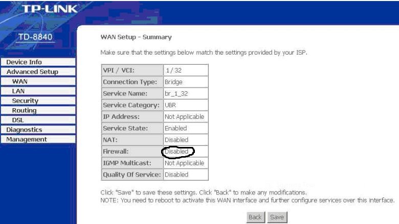 Знает-ли кто, как на модеме TP-Link TD-8840 - отключить firewall? По умолчанию стоит Enabled.