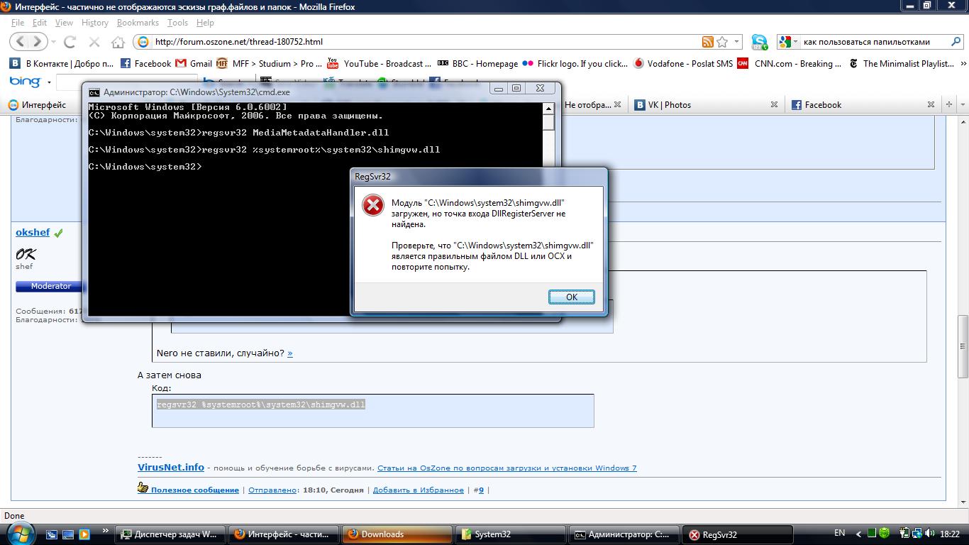 Профиль | Отправить PM | Цитировать видела на нескольких форумах у людей похожая проблема, они запускали regsvr32 %systemroot%\system32\shimgvw.dll и у них проблема решалась. у меня при вводе выдает следущее - см. файл error.jpg.