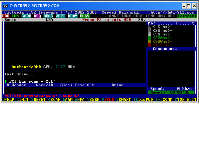 ![]() Да --- будем тестировать из-под DOS... 1. Сделайте из-под DOS загрузочную_ FDD/загрузочный_CD Где взять --- См. мою ссылку выше.. Ну вот Вам ещё раз... http://hdd-911.com/index.php?option=...ascdesc=DES C В архиве есть Help --- как просто сделать. 2 В BIOS установить загрузку с FDD или CD загрузитесь… Больше ничего в BIOS не править не надо --- работаем в DOS... 3. Сделайте тест Линейное чтение один к одному --- как написано здесь… http://hdd-911.com/index.php?option=...emid=27#dfcsop ЗЫ Хотите --- побалуйтесь с тестами чтения... Ну и SMART получите. Но, ни в коем случае пока не выполняйте Запись (стирание): --- потеряете данные… ЗЗы Приступайте с Богом... ![]() |