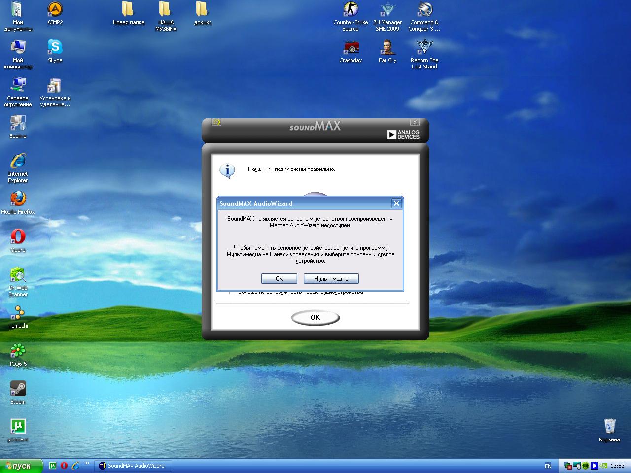 И так вторая тема созданная мною, и проблема о так и не решившимся звуке! После того как я смог установить драйвер все понеслось, перезагрузил комп. Вроде казалось бы все, но еще все было впереди. Вылезло окно, драйвер обнаружил устр-во все говорю я засунул этот провод туда, сюда, и т.п. когда сказал насчет микрофона (хотя вставлен он правильно) что он там стоит нажав ок , окошко зависло. Надежда на диспетчер задач, и закрывать это окошко. Перезагрузившись второй раз я вынул микрофон чтобы не завис, и нашел хотя бы наушники и был бы звук, но это слишком легко обозначив наушники , он сказал что я подсоединил правильно и было 2 кнопочки настроить и ок который приводил к окончанию диагностики, я нажал настроить вылезло странное окно (увидите на скрине) где я нажал мультимедия и открылась речь и аудиторства , там то меня пугало то ,что там нельзя было нечего выбрать не чего настроить. Как будто на моем компе и не было драйвера на звук... Все проблема . Решена будет только когда будет воспроизводиться звук .