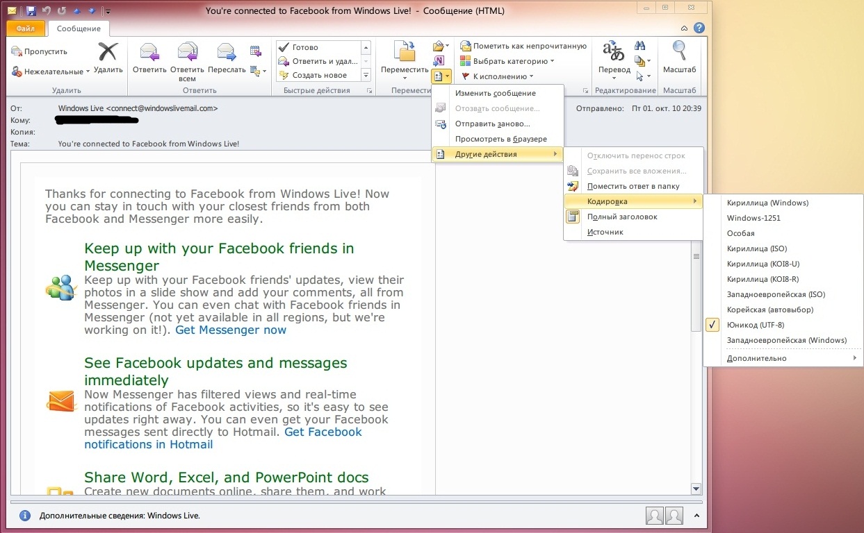 2010 - [решено] Как изменить кодировку входящего сообщения Microsoft Outlook 2010
