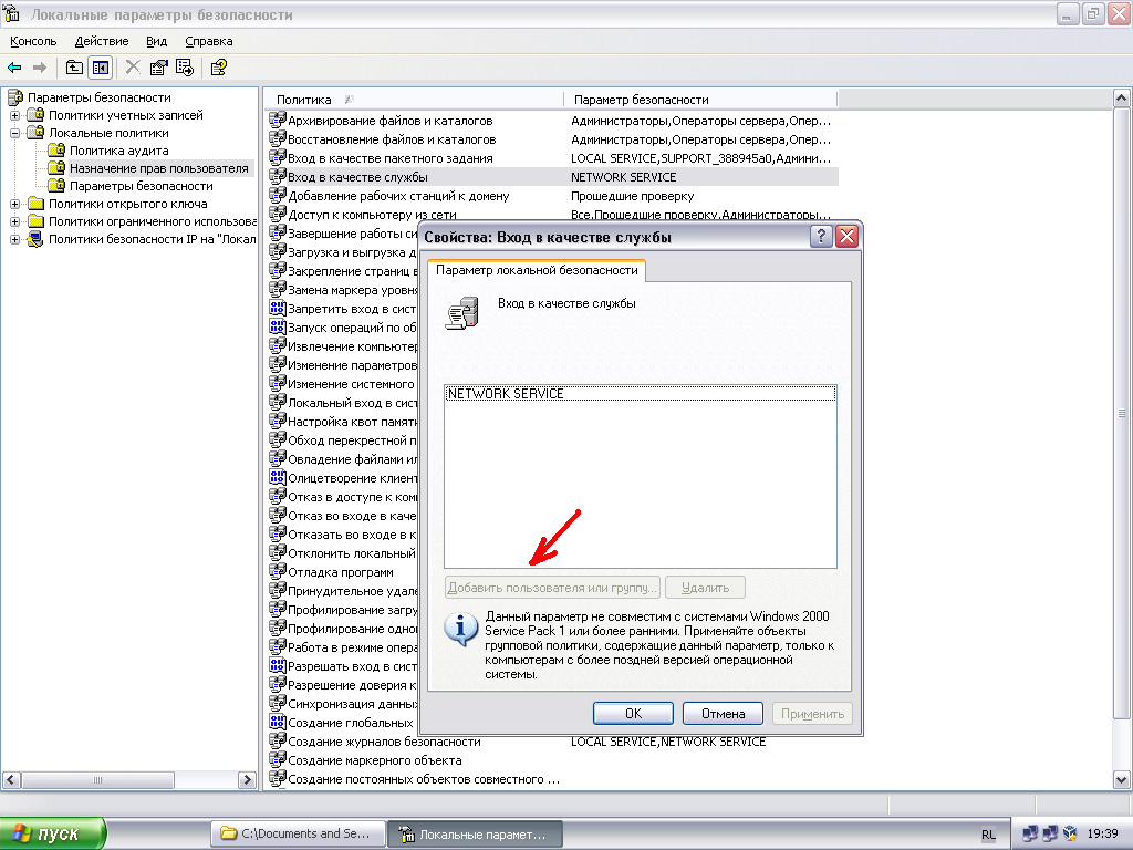 во-вторых, вы не можете изменить учетные записи, которые могут регистрировать процесс как службу, потому, что они определены в групповых политиках. (Обратите внимание на значок данного параметра, изображено 2 устройства с листком бумаги - это признак того, что параметр определен групповыми политиками, в других случаях изображено пол листа с нулями и единицами - это признак того. что политиками параметр не задан и его, при наличии соответствующих полномочий, можно изменить) В-третьих, о каких именно кластерах идет речь? Скорее всего вы не правильно поняли инструкцию. Учетную запись 2 го сервера добавить, скорее всего, необходимо в другом параметре, так как регистрировать процесс как службу учетные записи компьютеров не должны. Более того, что то я не припоминаю, что-бы для создания кластеров (NLB или FailOver) необходимо проделывать данную операцию. Проверьте соответствие имеющейся инструкции, типу вашей ОС и типу требуемого кластера. В-четвертых, исправить это можно, либо добавлением учетной записи в требуемый параметр через ГП, либо отменить определение данного параметра через ГП, либо изменить объекты применения политики ГП, в которой определен данный параметр, так, чтобы к требуемому серверу данная политика не применялась. |