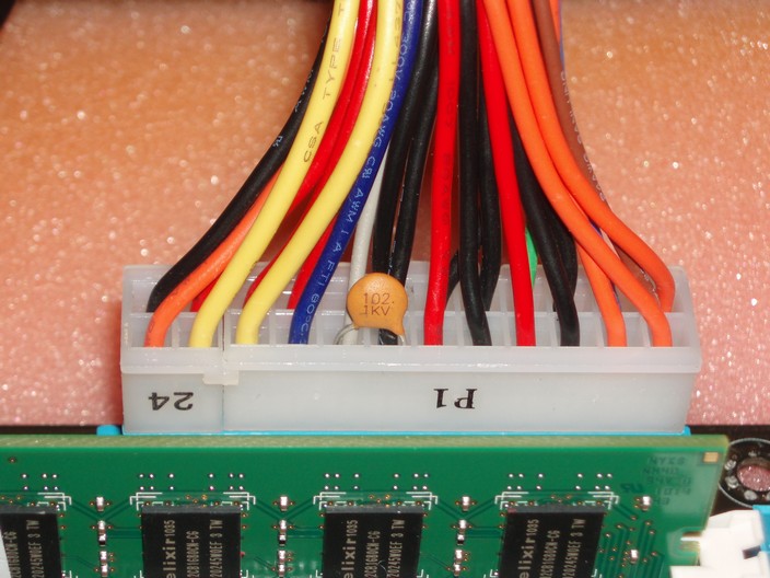 Выглядит это так: - при включении компьютера, система стартует, но через 3-5 секунд, срабатывает защита БП, и система входит в циклический рестарт: - МВ с другими моделями БП - работает без проблем; - БП с другими МВ тоже работает без проблем (ну естественно из того, что нашлось под рукой). При попытках промерить напряжения на разъеме БП/МВ, наколхозилось следующее. Когда подключаешь щуп прибора на контакт pwr_ok в разъеме БП (серый провод с обратной от замка стороны и второй щуп на землю), то система стартует нормально. Мы предположили, что по сигнальному кабелю идут высокочастотные помехи. А собственная емкость прибора гасит их. Памятуя о том, что керамические конденсаторы гасят высокочастотные шумы, мы воткнули керамический конденсатор прямо сверху в колодку разъема (см. рисунок). Проблема вроде решилась. Если бы это для дома для семьи было, то так бы можно было и оставить. Но эти компьютеры расползутся по Москве, а может и по регионам. Кто, где и как их будет потом эксплуатировать неизвестно. Неизбежно возникнут вопросы по гарантии и т.д. и т.п. Вопрос состоит в том, что бы проверить наши выводы (проблема и в самом деле не совсем понятная) и дать совет, что можно сделать дальше, что бы обойтись меньшей кровью и затратами. Все-таки часть же комплектов заводится, значит эта несовместимость все-таки плавающая... |