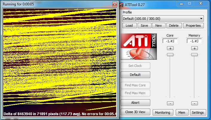 Решил проверить её на AtiTool v 0.26, также v 0.27 Если нажать Close 3D View то куб крутится и все ок (10+ минут проверял) Если нажать Scan for Artifacts то через 1-2 секунды после запуска начинается вот такая фигня как на рисунках (на обеих версиях программы) Также проверял эту видеокарту программами FurMark , TessMark и GPU Caps Viewer - все видео были нормальными без глюков. Температура при крит нагрузке выше 65 градусов не поднималась. Проц Core i5-750, мать P7P55D, БП - Chieftec CFT-650-14C Разгоном не занимался. Это нормально или нет что AtiTool выдает такие желтые полоски при тесте на стабильность??? АтиТул 2007г (последняя версия) может это играет какую то роль, но тогда и в старых играх могут быть глюки или все таки это видеокарта плохая ? |